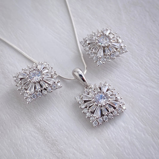 Square Baguette Halo Studs and Pendant Set